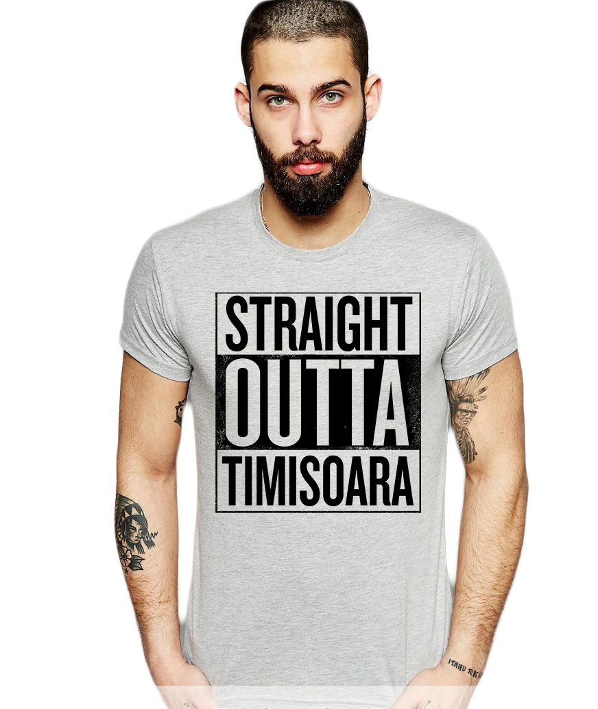 Tricou barbati gri cu text negru - Straight Outta Timisoara