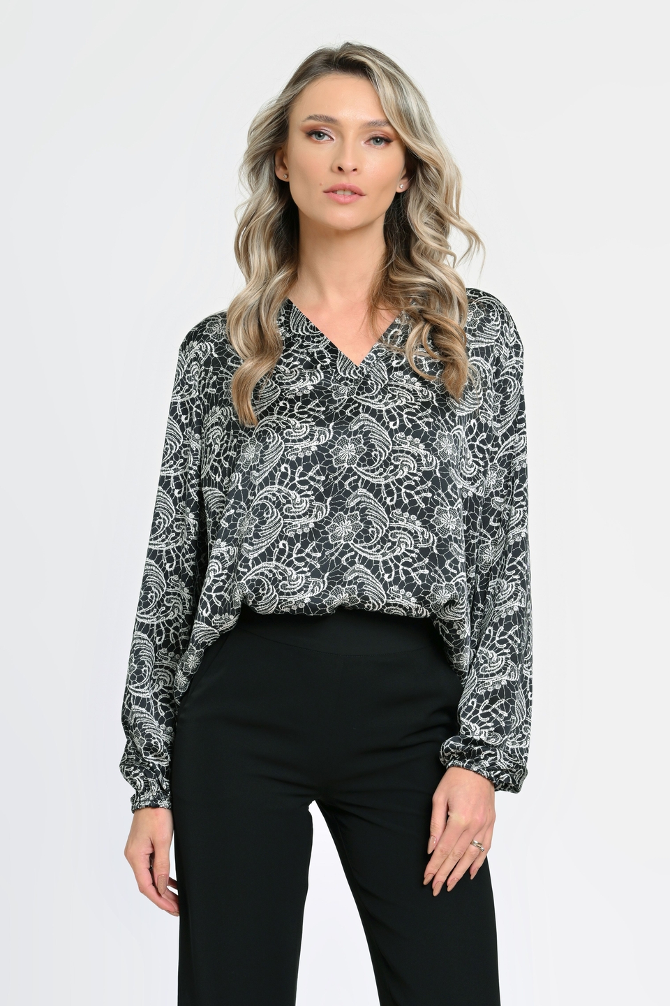 Bluza Dama cu Maneca lunga tip Kimono, Negru cu Alb stil Baroque